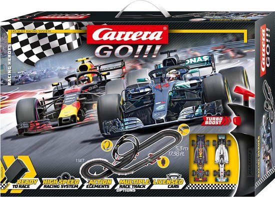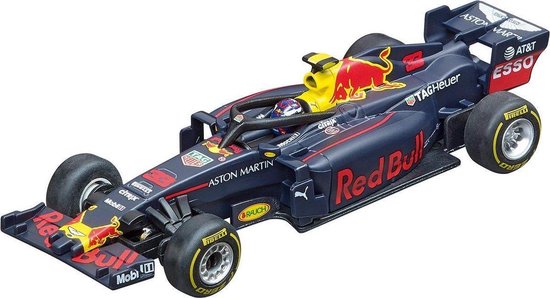 - Mercedes-AMG F1 W09 EQ Power+ “Lewis Hamilton, No.44” | Red Bull Racing RB14 “Max Verstappen, No.33” | 2 Speed-Controllers | 1 Recht stuk met rondeteller | 1 Aansluitrail start/finish |8 Rechte stukken | 6 Bochten | 1 Looping | 1 Transformator | 10 Rijbaansteunen | 4 Vangrailen | 2 Geleidepinnetjes | Handleiding